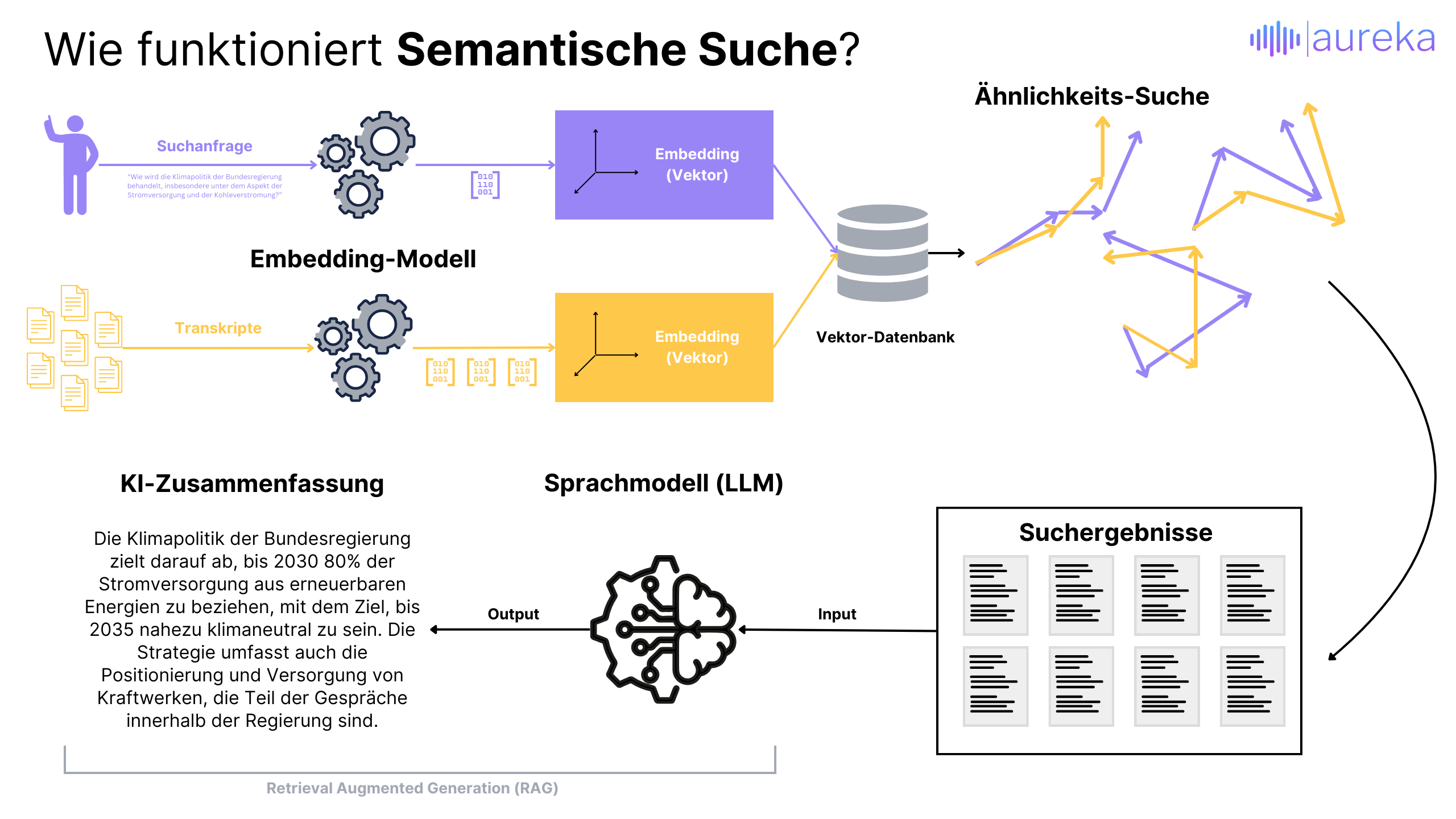 We are doing something very similar at aureka. In future, all transcripts, metadata and annotations uploaded to our platform will be searchable by semantic meaning. Regardless of whether we are talking about ten transcribed interviews or significantly larger amounts of data: With our semantic search, passages in the original material can be found even better and more precisely. This is made possible by the semantic search described above.